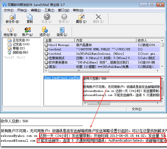 - 增加任务停止原因,可以方便查到任务为什么停止;下面任务消息中将显示每个邮箱的状态,能看到那个邮箱达到了策略的限制、那个邮箱不能发邮件了。