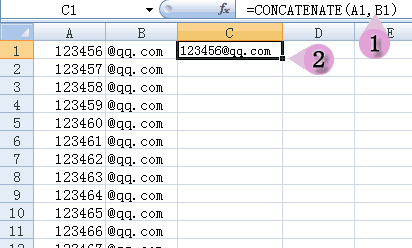 在第三列中录入 =CONCATENATE(A1,B1) (下图1位置)含义是将A1和B1合并,新列会自动合并的。然后用鼠标按住右下侧的小方点(下图中的2位置),然后向下拉鼠标,会自动录入公式的。