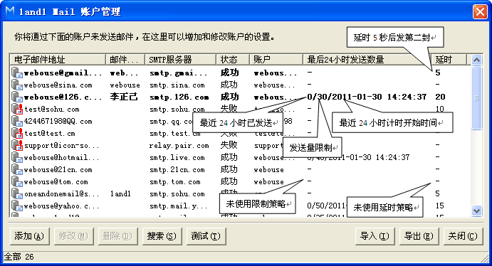 打开账户管理,如下图,会看到“最后24小时发送量”,包含3个数据,如“0/100/2011-2-12 02:20:30”,第一个数据是最近24小时实际发送的数量,第二数据是策略中设置的数据,第三个是最近24小时开始时间。