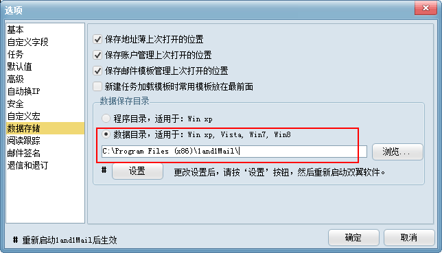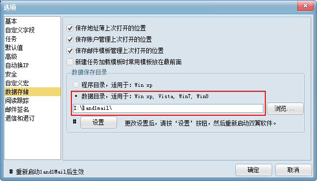 步骤:数据保存目录选中“数据目录,适用于:Winxp, Vista, Win7, Win8”,然后按“浏览”按钮,选择优盘上的一个目录,然后点“设置”按钮,然后重新启动双翼软件。