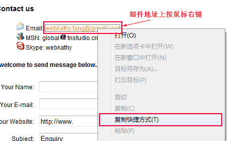 在网页中找到邮件地址的链接,在链接上按鼠标右键,然后在右键菜单中选择【复制快捷方式】,邮件地址将自动增加到地址列表中。见下图