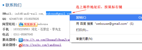 1、选择邮件地址,使用鼠标拖动选择邮件地址,使其反显(蓝色背景,白色字)。