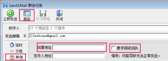 双翼邮件群发软件提供“要求阅读回执”和“回复地址”功能,如下图,在群发任务的“高级”->“其他”中能找到。