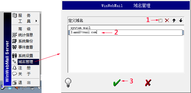 操作步骤:鼠标单击任务栏上的WinWebMail图标,弹出菜单中选择“域名管理”,然后按“添加”按钮,录入域名,不带www,例如yourdomail.com,然后按对勾保存。操作见下图。