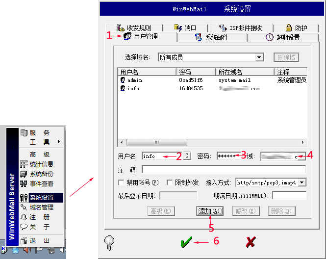 操作步骤:鼠标单击任务栏上的WinWebMail图标,弹出菜单中选择“系统设置”,选择“用户管理”,下方录入“用户名”“密码”,选择上一个步骤添加的域名,然后按“添加”按钮,最后按对勾保存。操作如下图。