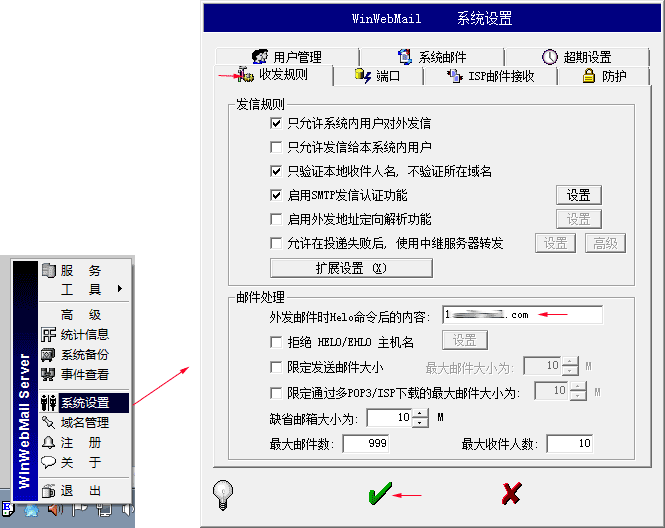 操作步骤:鼠标单击任务栏上的WinWebMail图标,弹出菜单中选择“系统设置”,选择“收发规则”,“外发邮件时Helo命令的内容”录入新添加的域名。操作见下图。