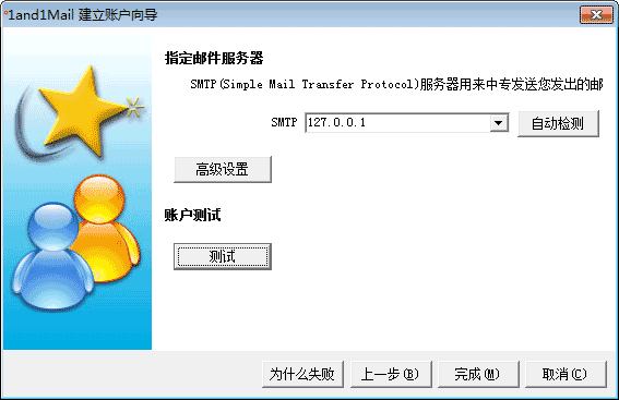 在双翼软件中添加账户需要注意的是SMTP服务器,本次测试是在本机上安装的WinWebMail,所以SMTP服务器地址就是本机IP: 127.0.0.1,在这里要填写安装有WinWebMail计算机的IP地址(局域网IP,广域网IP都可以)。