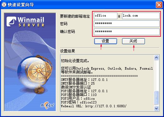 下载后安装,按照安装步骤进行安装,最后一步要设置一个邮箱和密码,然后按“设置”按钮,发送可以用这个邮箱来发送,如下图。