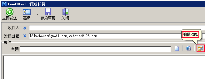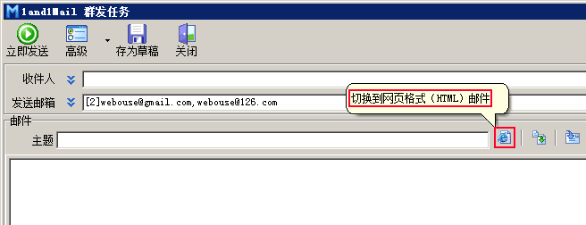 建立群发任务时,在“主题”录入框后面按“切换到网页格式(HTML)邮件”按钮,如下图。