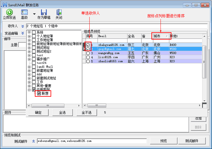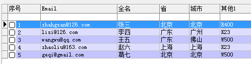 2、鼠标在列标题上点击,将会按列进行排序,如下图是按城市进行排序的,可以很方便的选择相同城市的客户,然后在前面打钩即可(按住鼠标左键向下移动,可以一次选择多个收件人)。