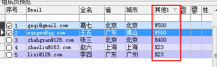 上面的方法是双翼软件的标准使用方法,用起来也很方便。下面情况用起来就不太方便了,下图是购买联想笔记本电脑客户记录,分省份、城市,笔记本型号(其他1),如果只想给某个城市的客户发邮件,或者只给买了某个型号的笔记本用户发邮件,如果按上述方法要先建立分组,然后将符合条件的内容加入分组,然后再发送,操作就太麻烦了,因为要建立很多的分组,而且添加了新客户后,要更新很多的组才可以。
