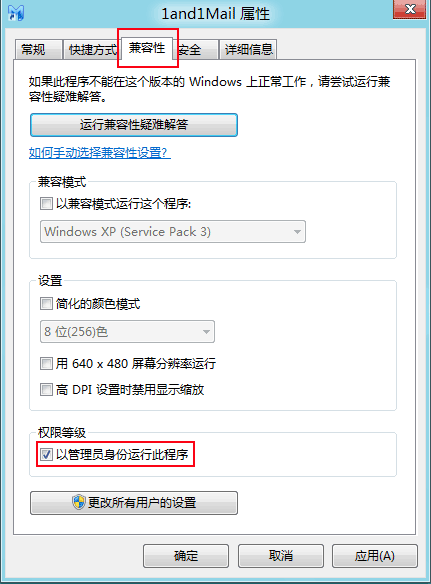 在桌面上找到1and1Mail快捷方式,点右键,右键菜单选择“属性”,打开属性窗口,如下图,然后切换到“兼容性”页,选上后面的“以管理员身份运行此程序”,然后按“确定”。