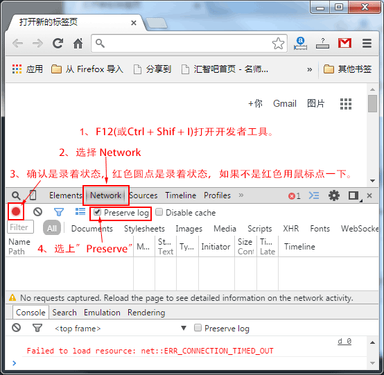 1、打开Chrome浏览器开发者工具,并选择录制状态,选择“Preserve log”。