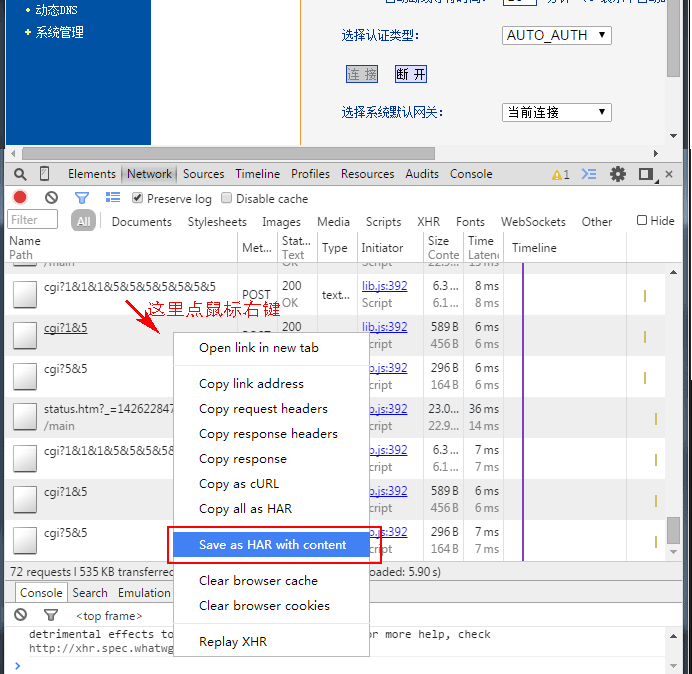 这样操作完成后,所有控制路由器的网络命令将保存在.har文件中。