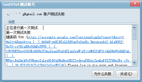 Gmail谷歌邮箱账户测试失败,出现如下提示: