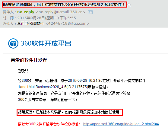 双翼邮件群发软件4.5版发布后,一直受360杀毒软件的误报困扰,尤其是个人版和商业版误报严重,甚至安装好后的卸载程序也会被360误报为病毒。