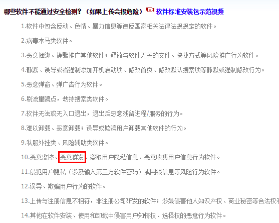 报告病毒的原因是:不能通过安全检测,也就是群发类软件不能通过安全检测,下面是360不能通过安全检测的条件,包含“恶意群发”。
