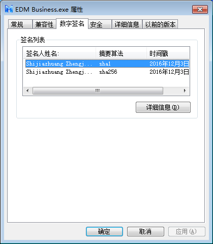 如下图显示的是双翼邮件群发软件商业版的执行文件数字签名,签名人姓名为:Shijiazhuang Zhengji Internet Technology Co., Ltd.,这是公司的英文名字,因软件还在海外发布,因而使用了公司的英文名字。