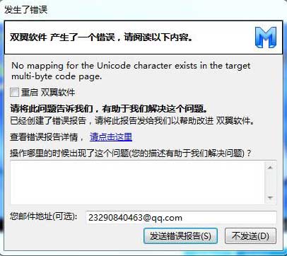 近日又有一个客户反馈双翼邮件群发软件启动时出现错误“No mapping for the Unicode character exists in the target multi-byte code page”如下图,进入双翼软件后大部分按钮无法操作。