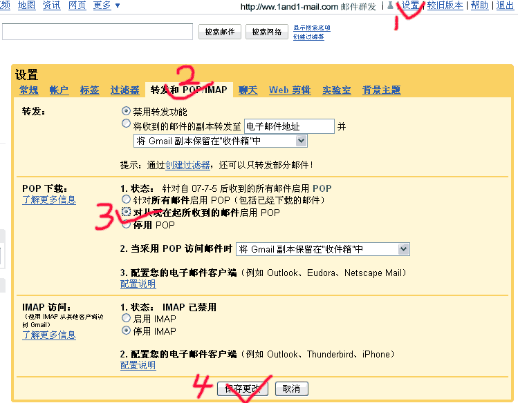 看下图,按图示1,2,3,4的步骤做就可以了。点击看大图。 查看更多免费邮箱的配置>>