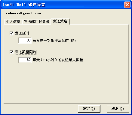- 发送延时:就是使用该账户发送邮件时,发送两封邮件之间最小的时间间隔,通过调整该参数可以控制邮件群发速度。查看常用免费邮箱策略设置。